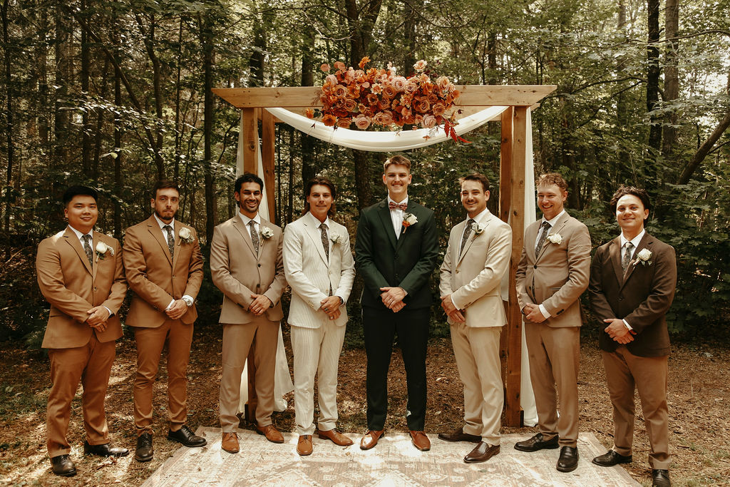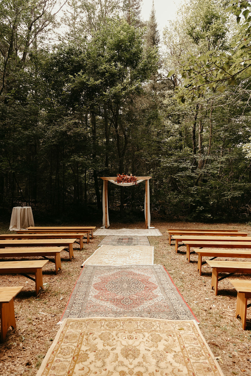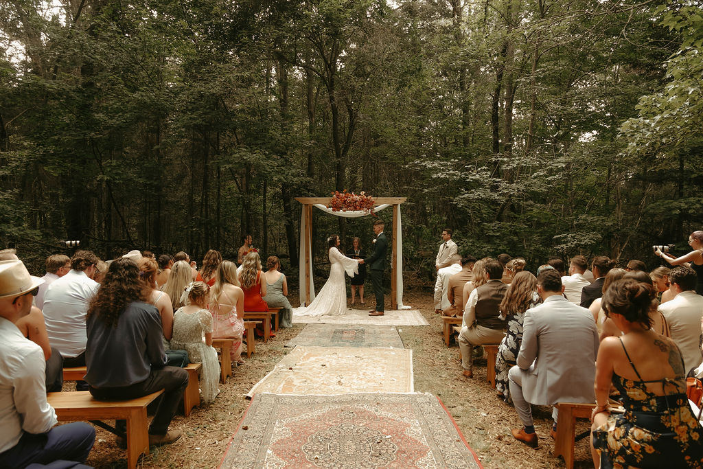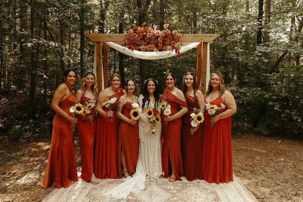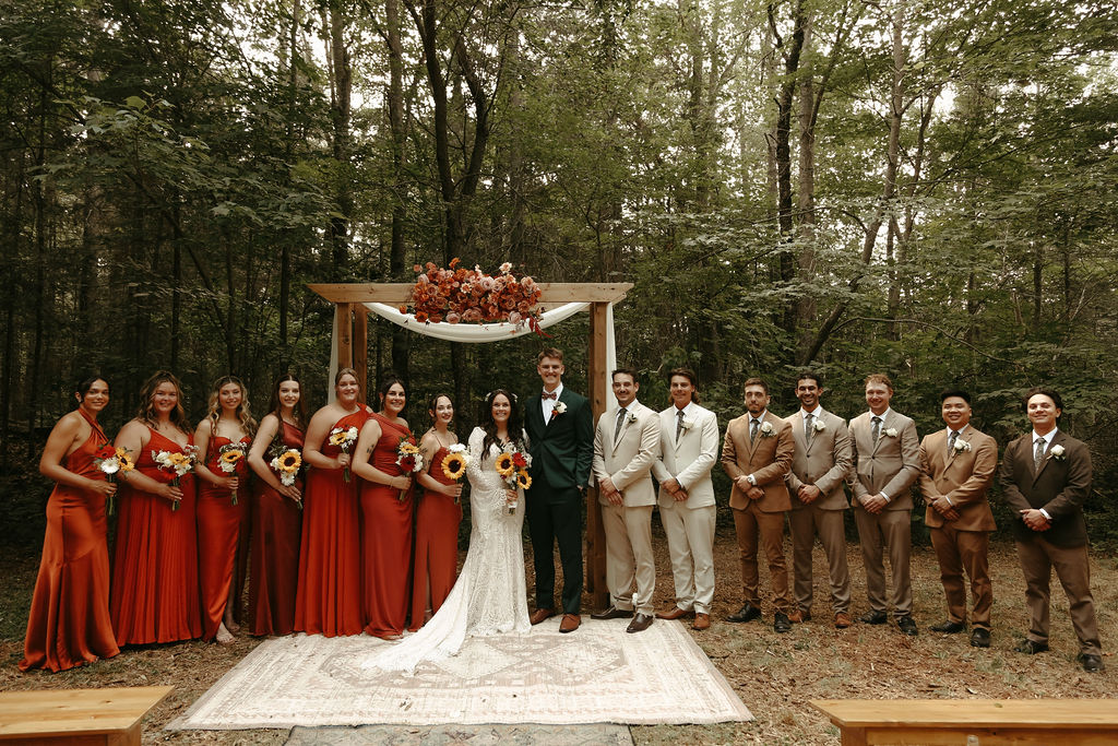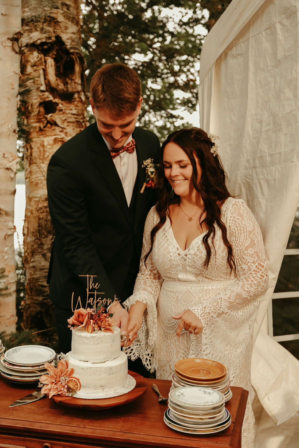 The theme was effortlessly boho chic, accented with terracotta and gold, and every element was polished to perfection. Guests were led down an aisle adorned with an eclectic mix of carpets, while flowers, lovingly arranged by the bridal party themselves, added a natural, intimate feel. Repurposed antique furniture added warmth and character, seamlessly blending with the lakefront scenery that provided the perfect backdrop for this heartfelt celebration.