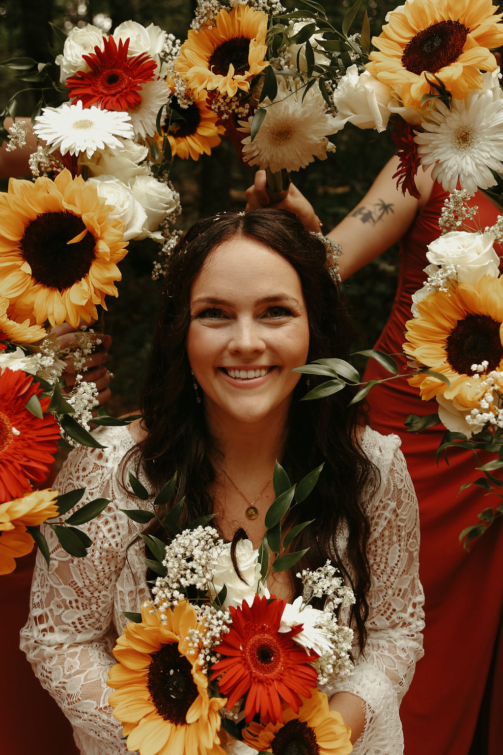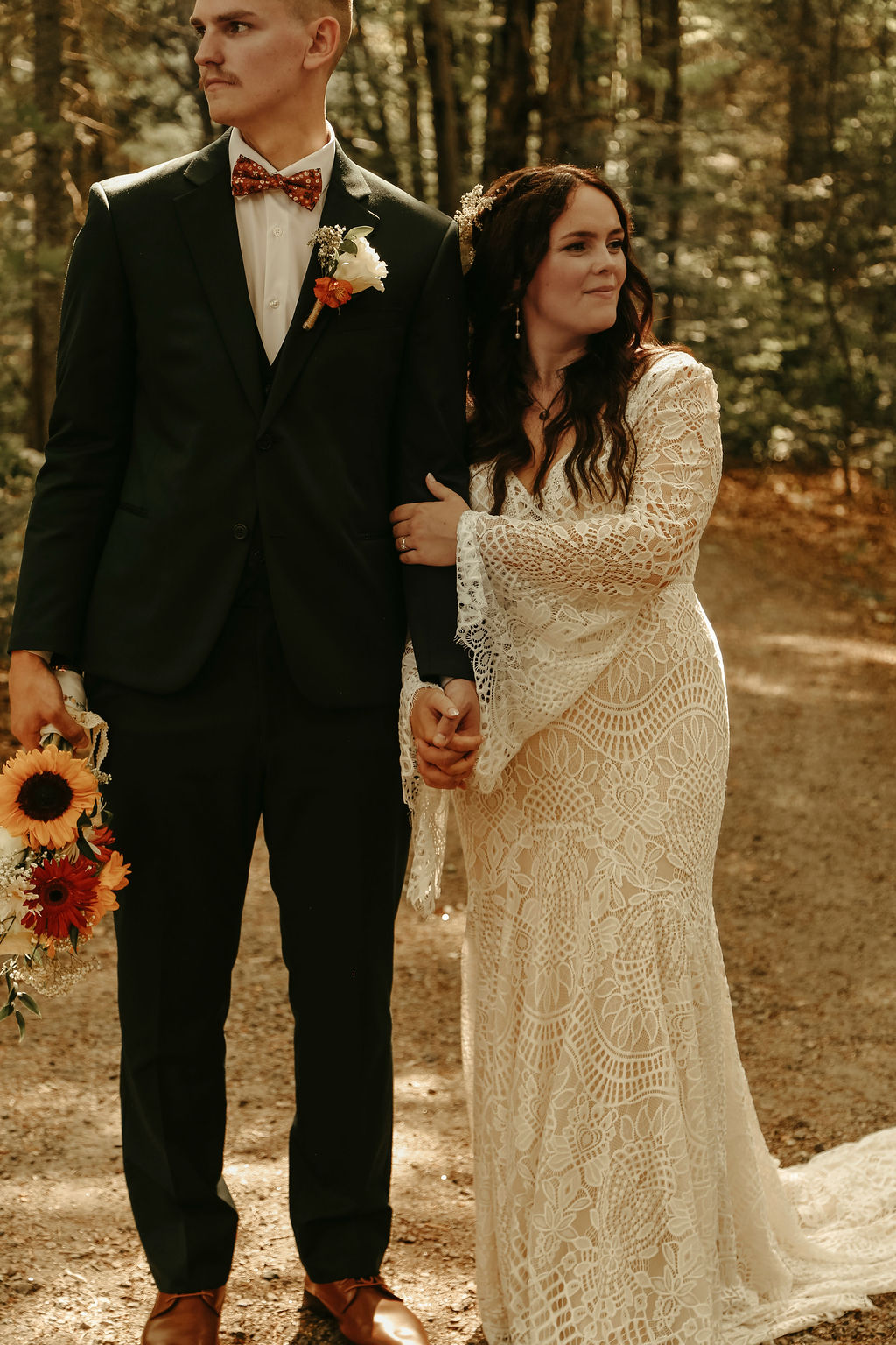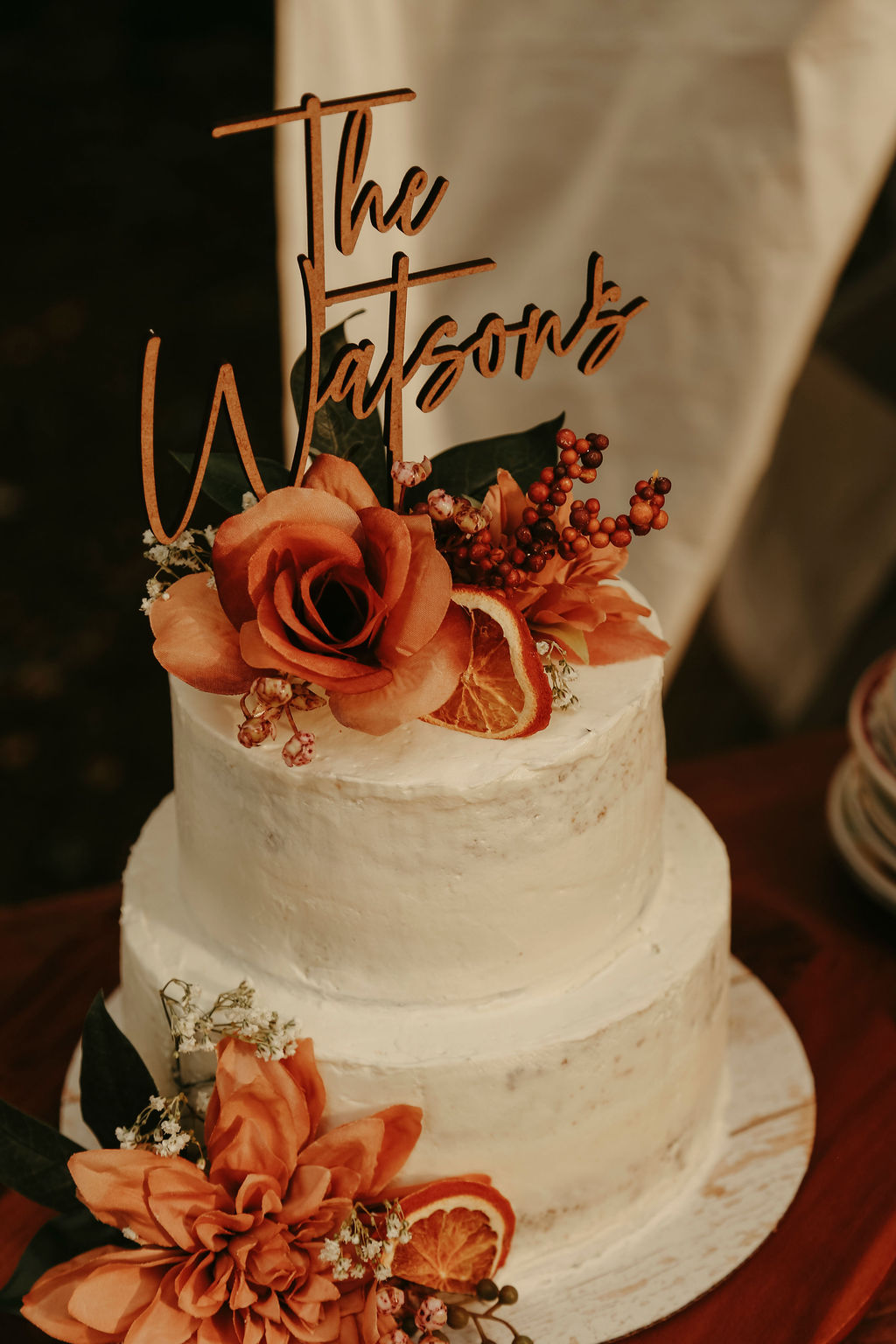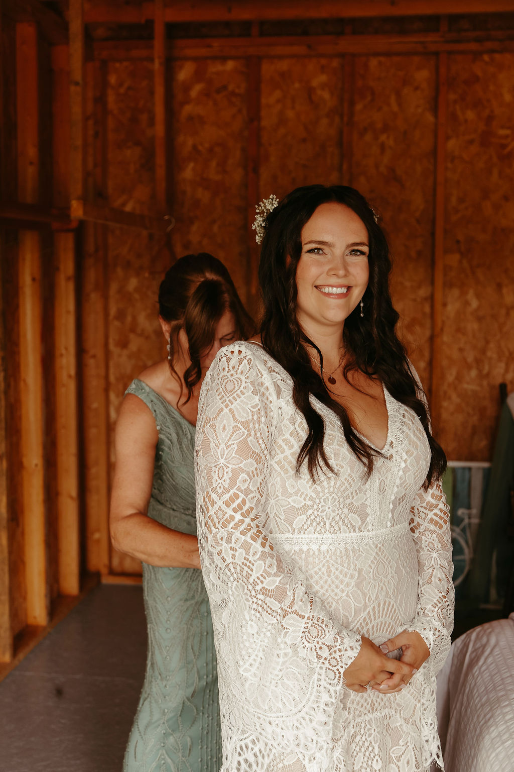 The theme was effortlessly boho chic, accented with terracotta and gold, and every element was polished to perfection. Guests were led down an aisle adorned with an eclectic mix of carpets, while flowers, lovingly arranged by the bridal party themselves, added a natural, intimate feel. Repurposed antique furniture added warmth and character, seamlessly blending with the lakefront scenery that provided the perfect backdrop for this heartfelt celebration.