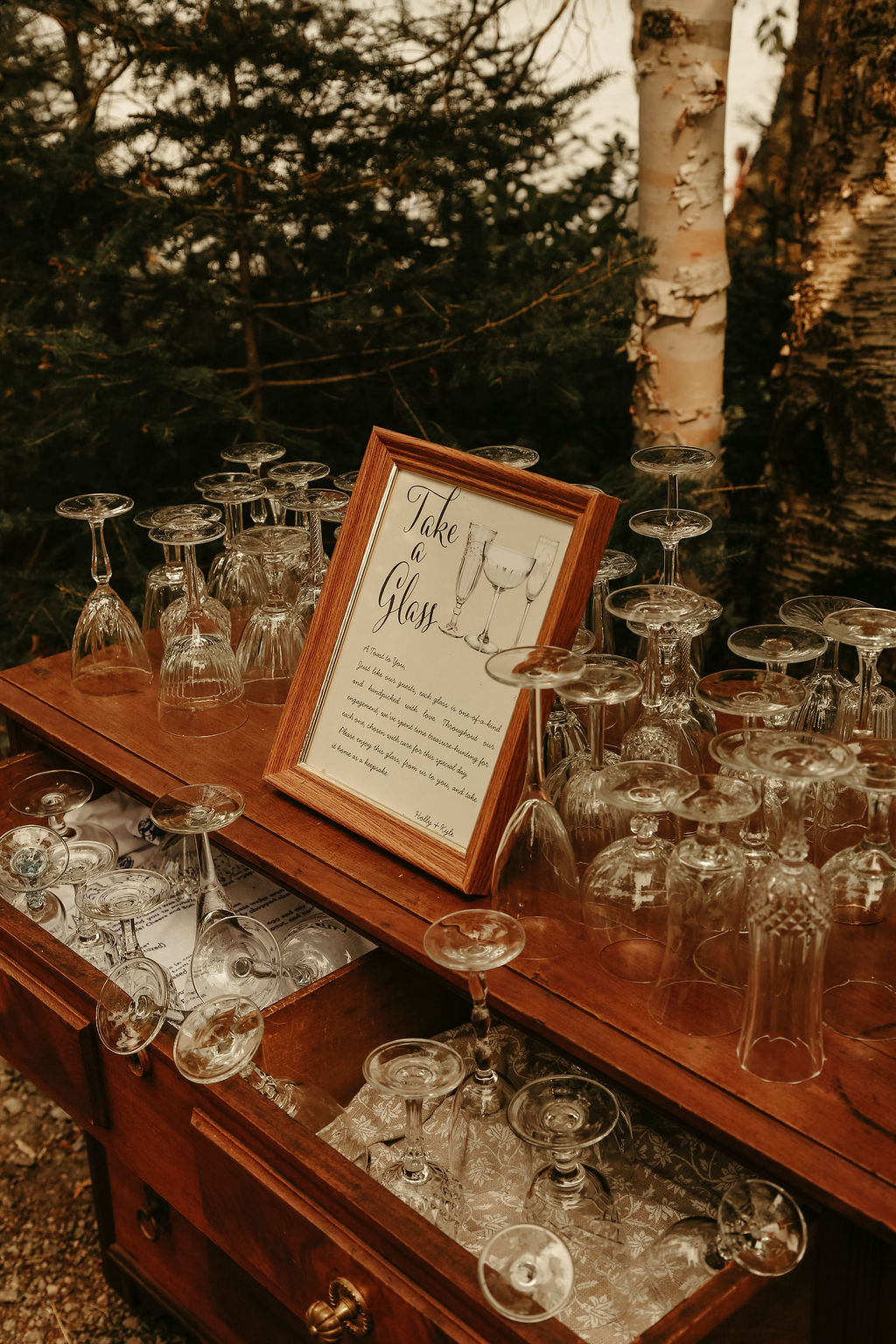 One of the most charming elements was their guest favors. Holly and Kyle had thoughtfully thrifted glassware, allowing each guest to select their own to enjoy throughout the evening—a small, personal touch that created a sense of shared experience and fun. They even sourced the cutest dessert plates for their cake and sweets, making every detail playful and unique.